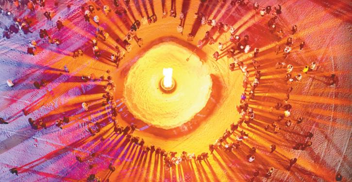春节期间,稻梦小镇每晚篝火熊熊,热闹非凡。游客们围着篝火载歌载舞,歌声与笑声交织,火光与夜色相融。(李浩摄)